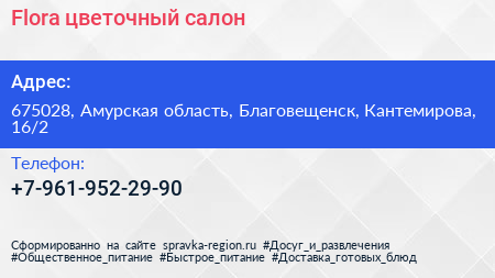 Flora, цветочный салон по адресу 675028, Амурская область, Благовещенск, Кантемирова, 16/2 в дальнейшем Организация, размещена в следующих категориях: