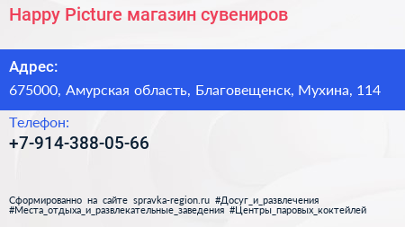 Happy Picture, магазин сувениров по адресу 675000, Амурская область, Благовещенск, Мухина, 114 в дальнейшем Организация, размещена в следующих категориях: