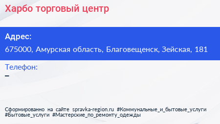 Харбо, торговый центр по адресу 675000, Амурская область, Благовещенск, Зейская, 181 в дальнейшем Организация, размещена в следующих категориях: