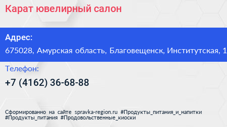 Карат, ювелирный салон по адресу 675028, Амурская область, Благовещенск, Институтская, 1 в дальнейшем Организация, размещена в следующих категориях: