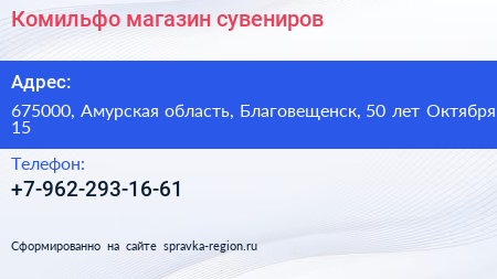 Комильфо, магазин сувениров по адресу 675000, Амурская область, Благовещенск, 50 лет Октября, 15 в дальнейшем Организация, размещена в следующих категориях: