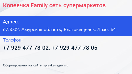 Копеечка Family, сеть супермаркетов по адресу 675002, Амурская область, Благовещенск, Лазо, 64 в дальнейшем Организация, размещена в следующих категориях:
