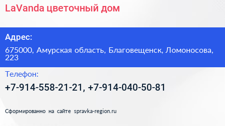 LaVanda, цветочный дом по адресу 675000, Амурская область, Благовещенск, Ломоносова, 223 в дальнейшем Организация, размещена в следующих категориях: