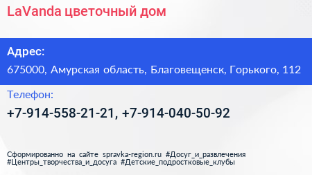 LaVanda, цветочный дом по адресу 675000, Амурская область, Благовещенск, Горького, 112 в дальнейшем Организация, размещена в следующих категориях: