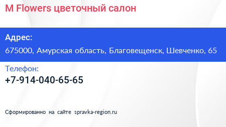 M-Flowers, цветочный салон по адресу 675000, Амурская область, Благовещенск, Шевченко, 65 в дальнейшем Организация, размещена в следующих категориях: