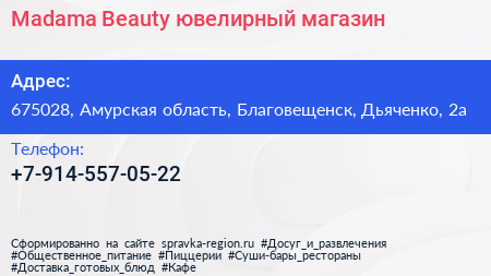 Madama Beauty, ювелирный магазин по адресу 675028, Амурская область, Благовещенск, Дьяченко, 2а в дальнейшем Организация, размещена в следующих категориях: