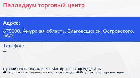 Палладиум, торговый центр по адресу 675000, Амурская область, Благовещенск, Островского, 56/2 в дальнейшем Организация, размещена в следующих категориях: