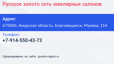 Русское золото, сеть ювелирных салонов по адресу 675000, Амурская область, Благовещенск, Мухина, 114 в дальнейшем Организация, размещена в следующих категориях: