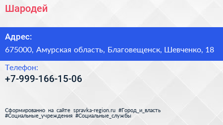 Шародей по адресу 675000, Амурская область, Благовещенск, Шевченко, 18 в дальнейшем Организация, размещена в следующих категориях: