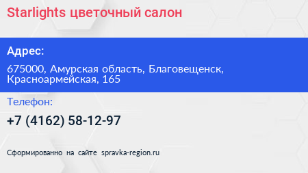Starlights, цветочный салон по адресу 675000, Амурская область, Благовещенск, Красноармейская, 165 в дальнейшем Организация, размещена в следующих категориях: