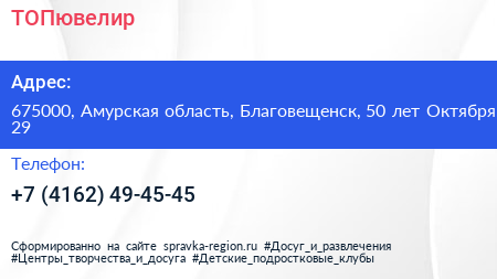 ТОПювелир по адресу 675000, Амурская область, Благовещенск, 50 лет Октября, 29 в дальнейшем Организация, размещена в следующих категориях: