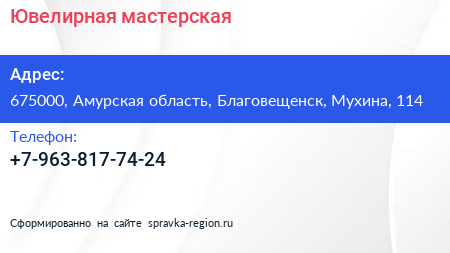 Ювелирная мастерская по адресу 675000, Амурская область, Благовещенск, Мухина, 114 в дальнейшем Организация, размещена в следующих категориях: