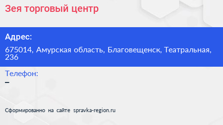 Зея, торговый центр по адресу 675014, Амурская область, Благовещенск, Театральная, 236 в дальнейшем Организация, размещена в следующих категориях: