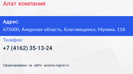 Алат, компания по адресу 675000, Амурская область, Благовещенск, Мухина, 118 в дальнейшем Организация, размещена в следующих категориях: