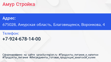 Амур Стройка по адресу 675028, Амурская область, Благовещенск, Воронкова, 4 в дальнейшем Организация, размещена в следующих категориях: