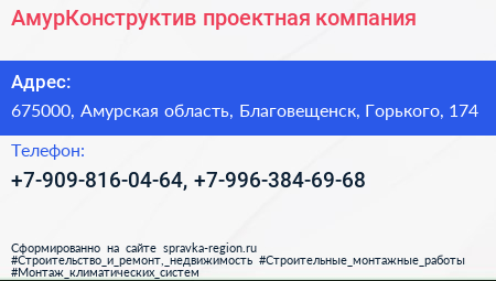 АмурКонструктив, проектная компания по адресу 675000, Амурская область, Благовещенск, Горького, 174 в дальнейшем Организация, размещена в следующих категориях: