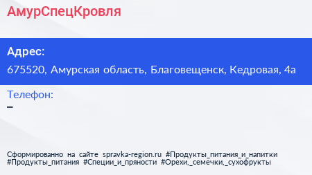 АмурСпецКровля по адресу 675520, Амурская область, Благовещенск, Кедровая, 4а в дальнейшем Организация, размещена в следующих категориях: