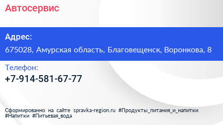 Автосервис по адресу 675028, Амурская область, Благовещенск, Воронкова, 8 в дальнейшем Организация, размещена в следующих категориях: