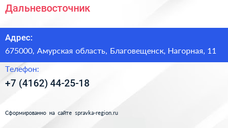Дальневосточник по адресу 675000, Амурская область, Благовещенск, Нагорная, 11 в дальнейшем Организация, размещена в следующих категориях:
