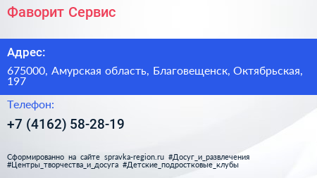 Фаворит-Сервис по адресу 675000, Амурская область, Благовещенск, Октябрьская, 197 в дальнейшем Организация, размещена в следующих категориях: