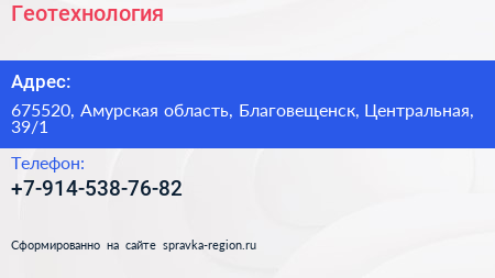 Геотехнология по адресу 675520, Амурская область, Благовещенск, Центральная, 39/1 в дальнейшем Организация, размещена в следующих категориях: