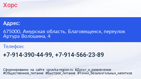 Хорс по адресу 675000, Амурская область, Благовещенск, переулок Артура Волошина, 4 в дальнейшем Организация, размещена в следующих категориях: