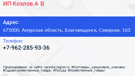 ИП Козлов А.В. по адресу 675000, Амурская область, Благовещенск, Северная, 163 в дальнейшем Организация, размещена в следующих категориях: