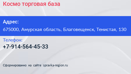 Космо, торговая база по адресу 675000, Амурская область, Благовещенск, Тенистая, 130 в дальнейшем Организация, размещена в следующих категориях: