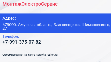 МонтажЭлектроСервис по адресу 675000, Амурская область, Благовещенск, Шимановского, 27 в дальнейшем Организация, размещена в следующих категориях: