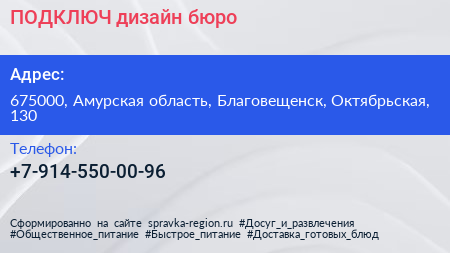 ПОДКЛЮЧ, дизайн-бюро по адресу 675000, Амурская область, Благовещенск, Октябрьская, 130 в дальнейшем Организация, размещена в следующих категориях: