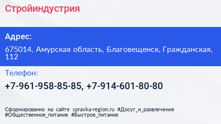 Стройиндустрия по адресу 675014, Амурская область, Благовещенск, Гражданская, 112 в дальнейшем Организация, размещена в следующих категориях: