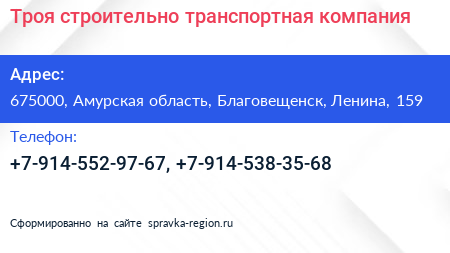 Троя, строительно-транспортная компания по адресу 675000, Амурская область, Благовещенск, Ленина, 159 в дальнейшем Организация, размещена в следующих категориях: