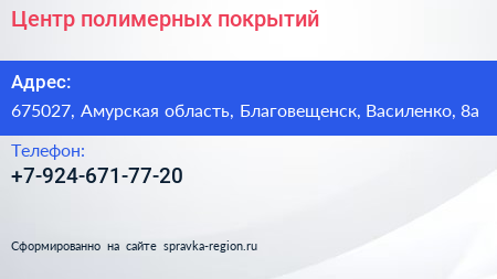 Центр полимерных покрытий по адресу 675027, Амурская область, Благовещенск, Василенко, 8а в дальнейшем Организация, размещена в следующих категориях: