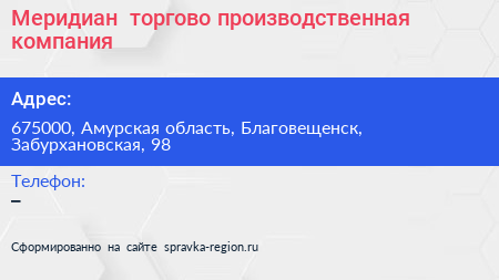 Меридиан+, торгово-производственная компания по адресу 675000, Амурская область, Благовещенск, Забурхановская, 98 в дальнейшем Организация, размещена в следующих категориях: