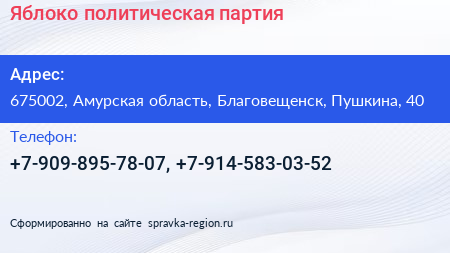 Яблоко, политическая партия по адресу 675002, Амурская область, Благовещенск, Пушкина, 40 в дальнейшем Организация, размещена в следующих категориях: