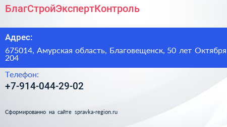 БлагСтройЭкспертКонтроль по адресу 675014, Амурская область, Благовещенск, 50 лет Октября, 204 в дальнейшем Организация, размещена в следующих категориях: