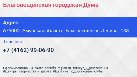 Благовещенская городская Дума по адресу 675000, Амурская область, Благовещенск, Ленина, 133 в дальнейшем Организация, размещена в следующих категориях: