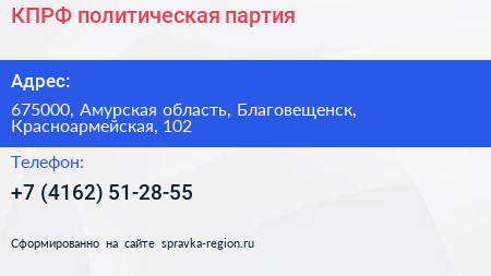 КПРФ, политическая партия по адресу 675000, Амурская область, Благовещенск, Красноармейская, 102 в дальнейшем Организация, размещена в следующих категориях: