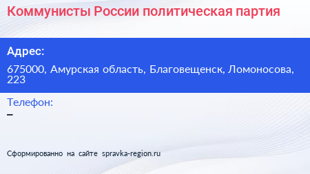 Коммунисты России, политическая партия по адресу 675000, Амурская область, Благовещенск, Ломоносова, 223 в дальнейшем Организация, размещена в следующих категориях: