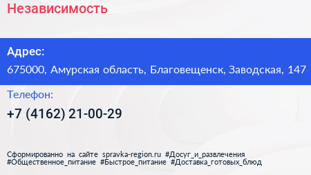 Независимость по адресу 675000, Амурская область, Благовещенск, Заводская, 147 в дальнейшем Организация, размещена в следующих категориях: