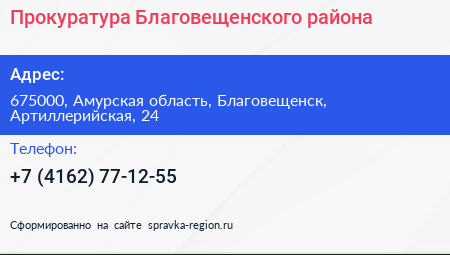 Прокуратура Благовещенского района по адресу 675000, Амурская область, Благовещенск, Артиллерийская, 24 в дальнейшем Организация, размещена в следующих категориях: