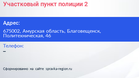 Участковый пункт полиции №2 по адресу 675002, Амурская область, Благовещенск, Политехническая, 46 в дальнейшем Организация, размещена в следующих категориях: