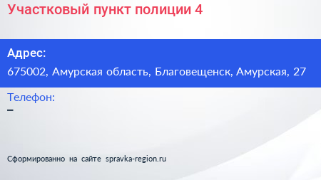 Участковый пункт полиции №4 по адресу 675002, Амурская область, Благовещенск, Амурская, 27 в дальнейшем Организация, размещена в следующих категориях: