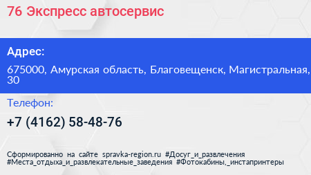 76 Экспресс, автосервис по адресу 675000, Амурская область, Благовещенск, Магистральная, 30 в дальнейшем Организация, размещена в следующих категориях: