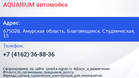AQUARIUM, автомойка по адресу 675028, Амурская область, Благовещенск, Студенческая, 15 в дальнейшем Организация, размещена в следующих категориях: