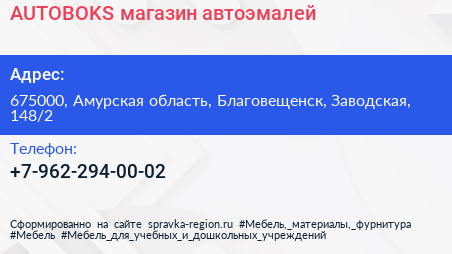 AUTOBOKS, магазин автоэмалей по адресу 675000, Амурская область, Благовещенск, Заводская, 148/2 в дальнейшем Организация, размещена в следующих категориях: