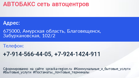 АВТОБАКС, сеть автоцентров по адресу 675000, Амурская область, Благовещенск, Забурхановская, 102/2 в дальнейшем Организация, размещена в следующих категориях: