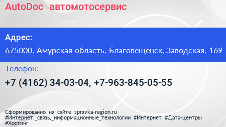 AutoDoc+, автомотосервис по адресу 675000, Амурская область, Благовещенск, Заводская, 169 в дальнейшем Организация, размещена в следующих категориях: