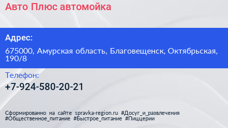Авто Плюс, автомойка по адресу 675000, Амурская область, Благовещенск, Октябрьская, 190/8 в дальнейшем Организация, размещена в следующих категориях: