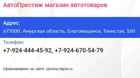 АвтоПрестиж, магазин автотоваров по адресу 675000, Амурская область, Благовещенск, Тенистая, 160 в дальнейшем Организация, размещена в следующих категориях: